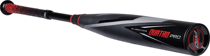 The New Rawlings Quatro Pro BBCOR Baseball Bat features a 2 5/8 inch barrel diameter, -3 length to weight ratio, balanced swing weighting, and is approved in High School and Collegiate Play.
